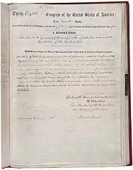While the Constitution does not provide the President any formal role in the amendment process, the joint resolution was sent to Lincoln for his signature.[65] Under the usual signatures of the Speaker of the House and the President of the Senate, President Lincoln wrote the word "Approved" and added his signature to the joint resolution on February 1, 1865.[66] On February 7, Congress passed a resolution affirming that the Presidential signature was unnecessary.[67] The Thirteenth Amendment is the only ratified amendment signed by a President, although James Buchanan had signed the Corwin Amendment that the 36th Congress had adopted and sent to the states in March 1861.[68][69]